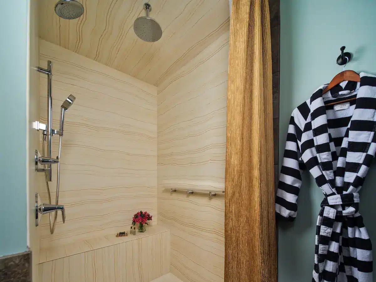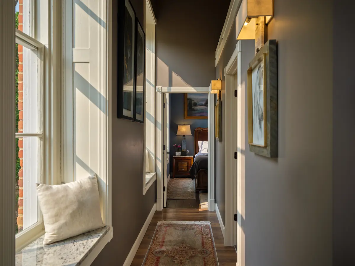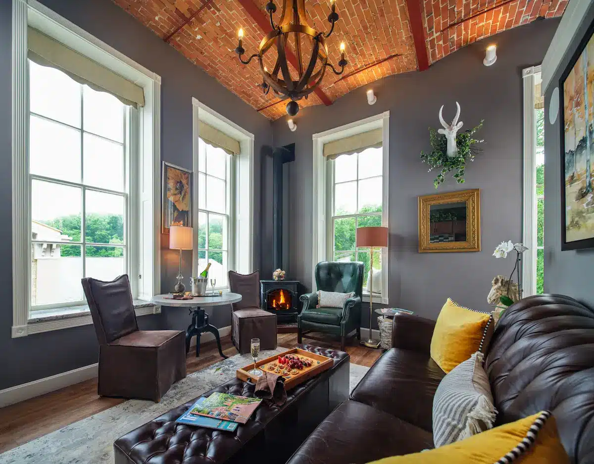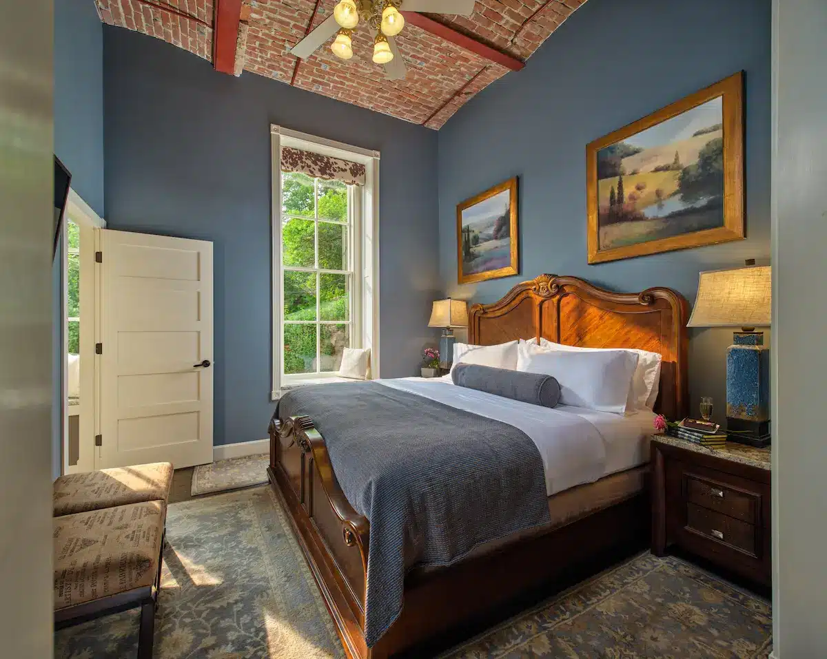 Showcasing architectural features of the old jail’s interior, Suite 201 occupies part of our bed and breakfast second floor where the sheriff and his family resided. This spacious suite is filled with abundant natural light from six stately windows that reach 9-feet tall and has an exposed curved brick ceiling that rises to 14-feet high. This guest suite is one of our most popular and the uniqueness of the layout makes it one of the most unique rooms to stay in.