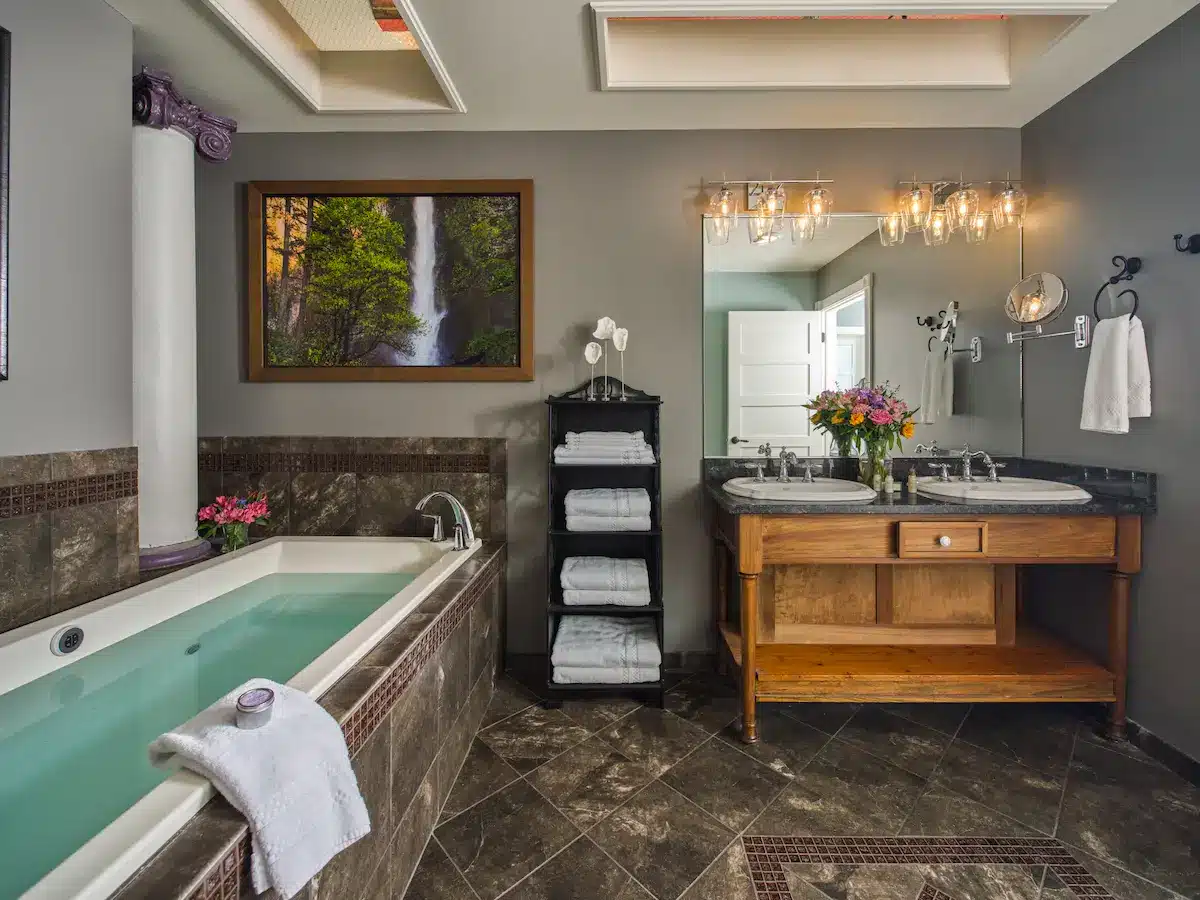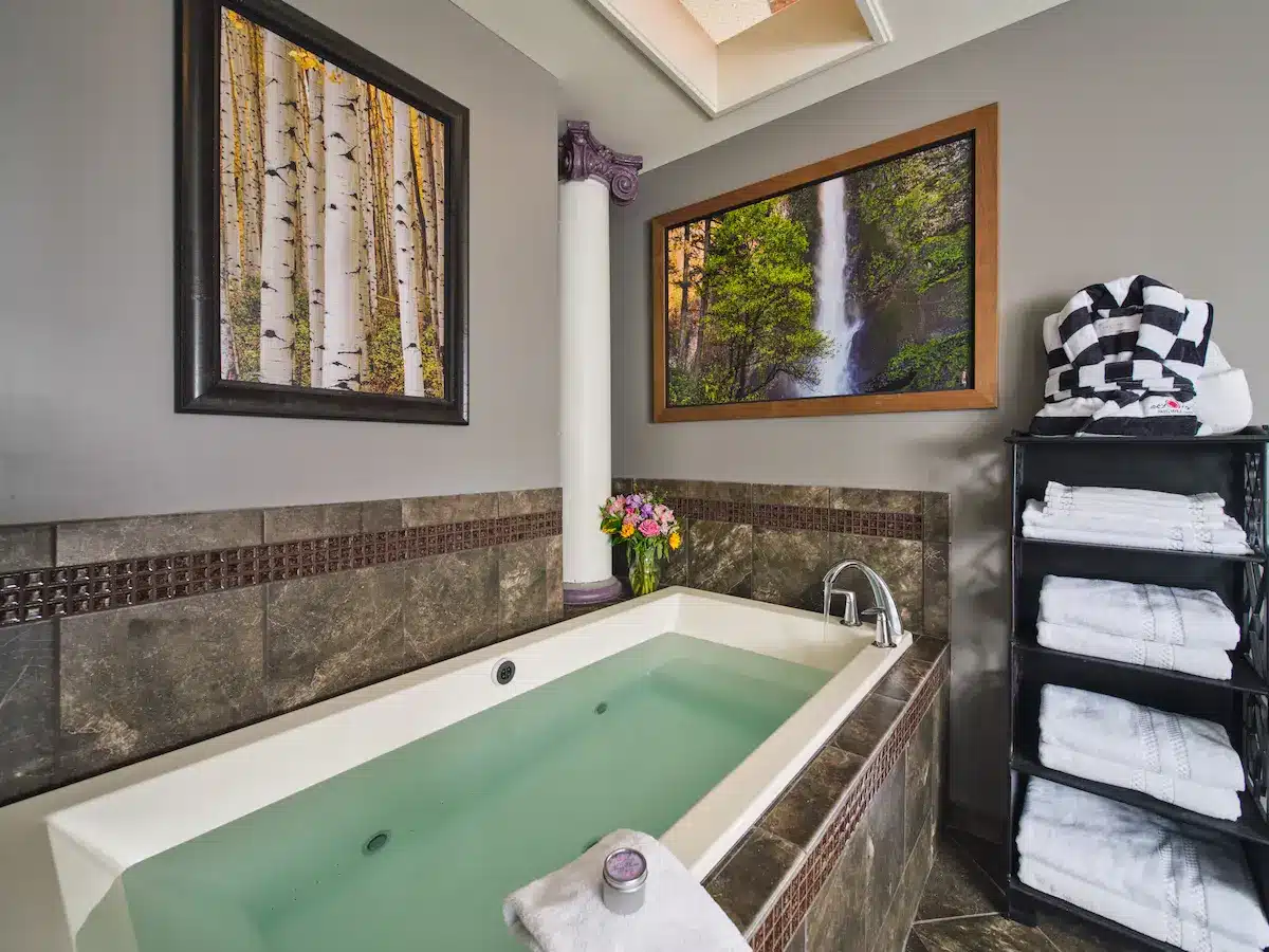 Tailored décor with rustic touches and rich, earthy tones create a relaxing retreat perfect for a Galena getaway, special anniversary or romantic birthday. The neighborhood views include the historic stone courthouse across the street and a front view looking towards downtown Galena.