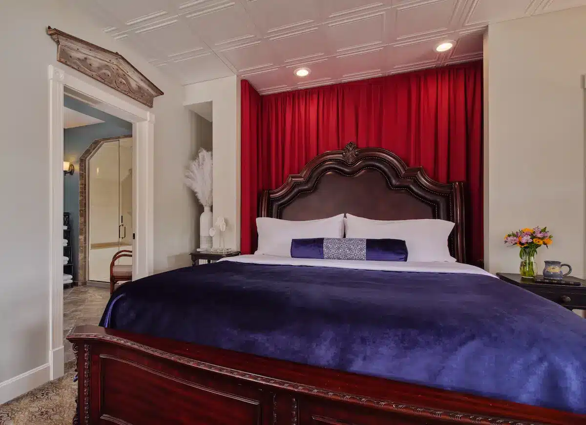 Suite 301 once housed a block of six jail cells for men, but has been transformed into a personal spa retreat with the inn’s only KOHLER® Steam Shower. Historic jail details, such as carvings of prisoners’ names in the front window woodwork, as well as the original cement floor peeking through as the fireplace hearth, add to the charm and character of this suite’s studio feel.
