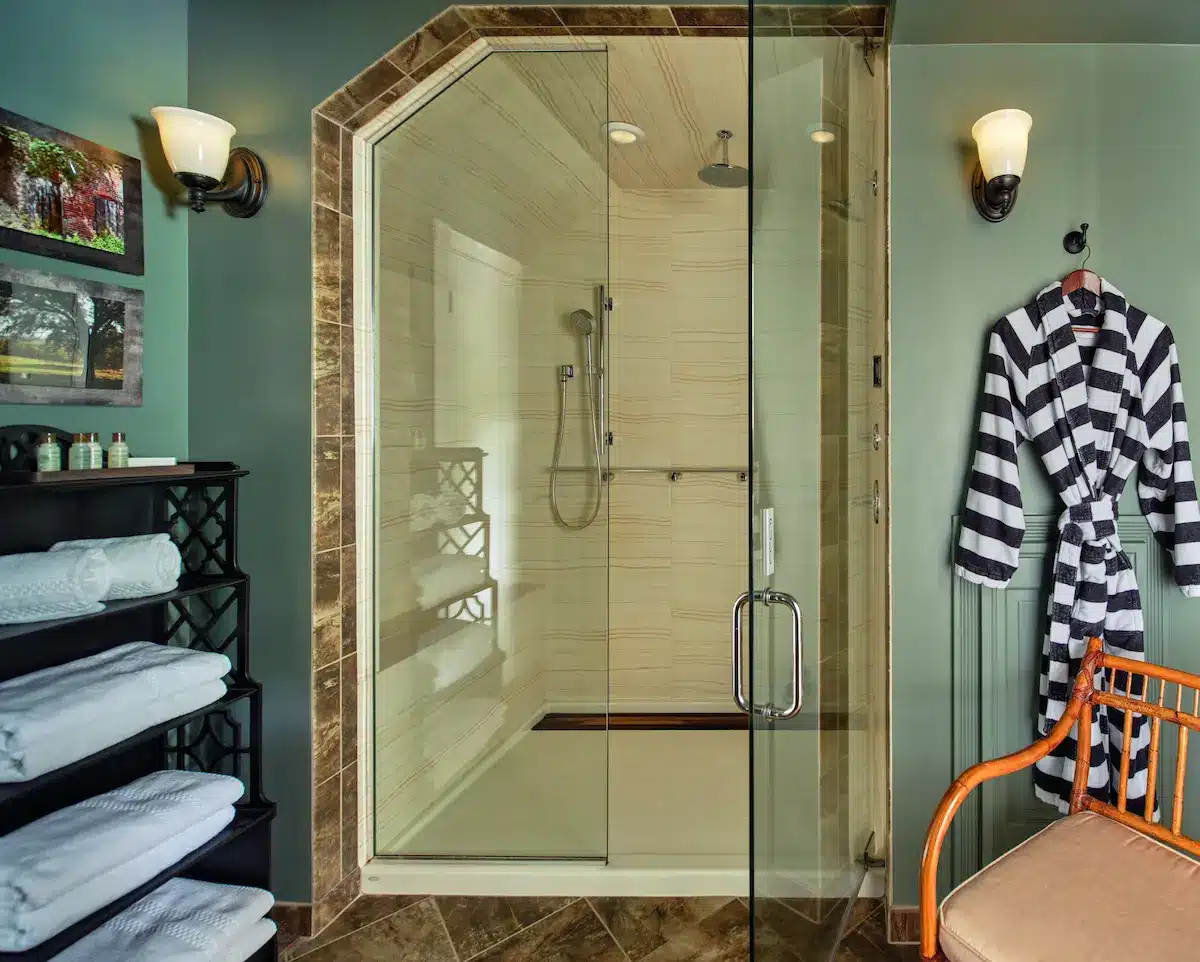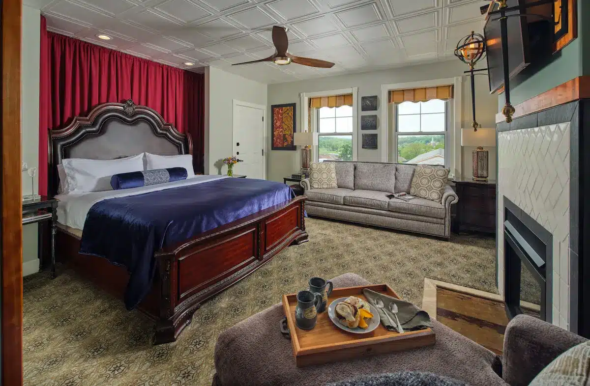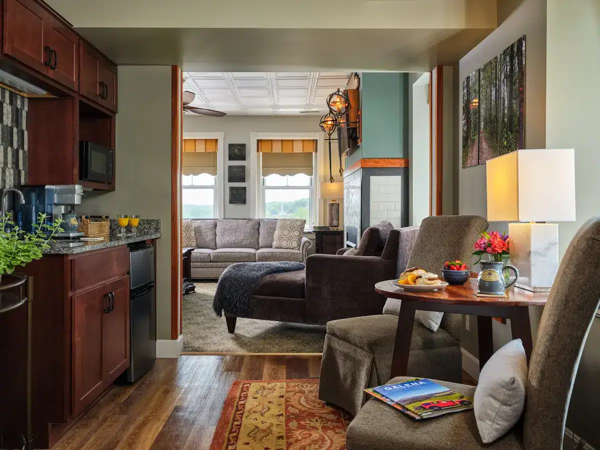 Located on the third floor of Jail Hill Inn, Suite 301 features bird’s eye neighborhood views, which include the historic stone courthouse across the street and a front view looking towards downtown Galena. For the ultimate spa getaway, schedule a relaxing in-room massage to complement the luxurious KOHLER® steam shower experience.
