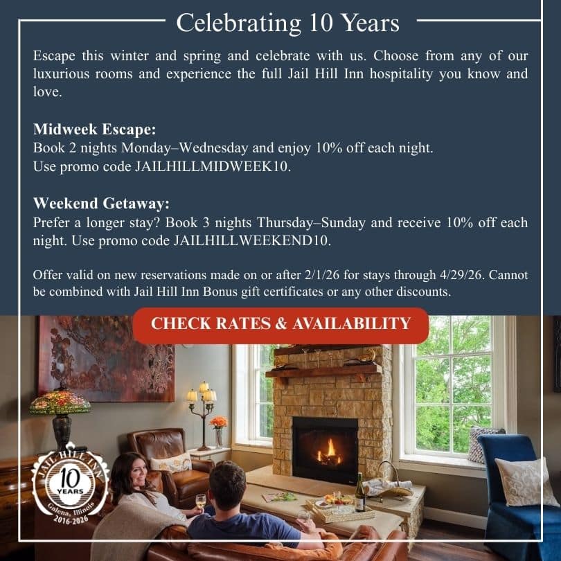 After your hiking or biking adventure, come back to the luxurious Jail Hill Inn, where an afternoon wine and cheese reception awaits. From there, it’s on to downtown Galena to enjoy the remainder of your evening. Summertime is a popular time of year to be in Galena. Make sure you plan your getaway well in advance, so you get the rooms and rates you want. Book your stay at Galena’s #1 rated Bed and Breakfast, Jail Hill Inn, today!